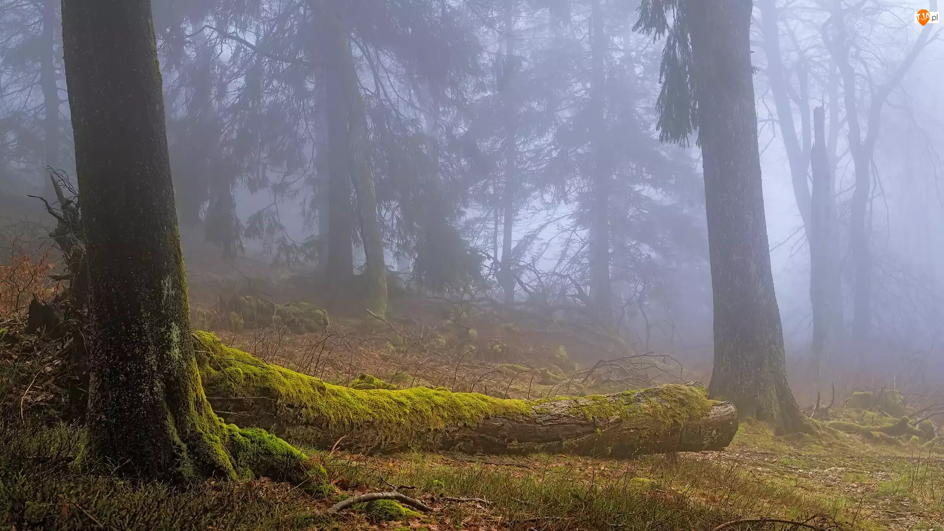 Omszałe, Drzewa, Mgła, Las, Pnie