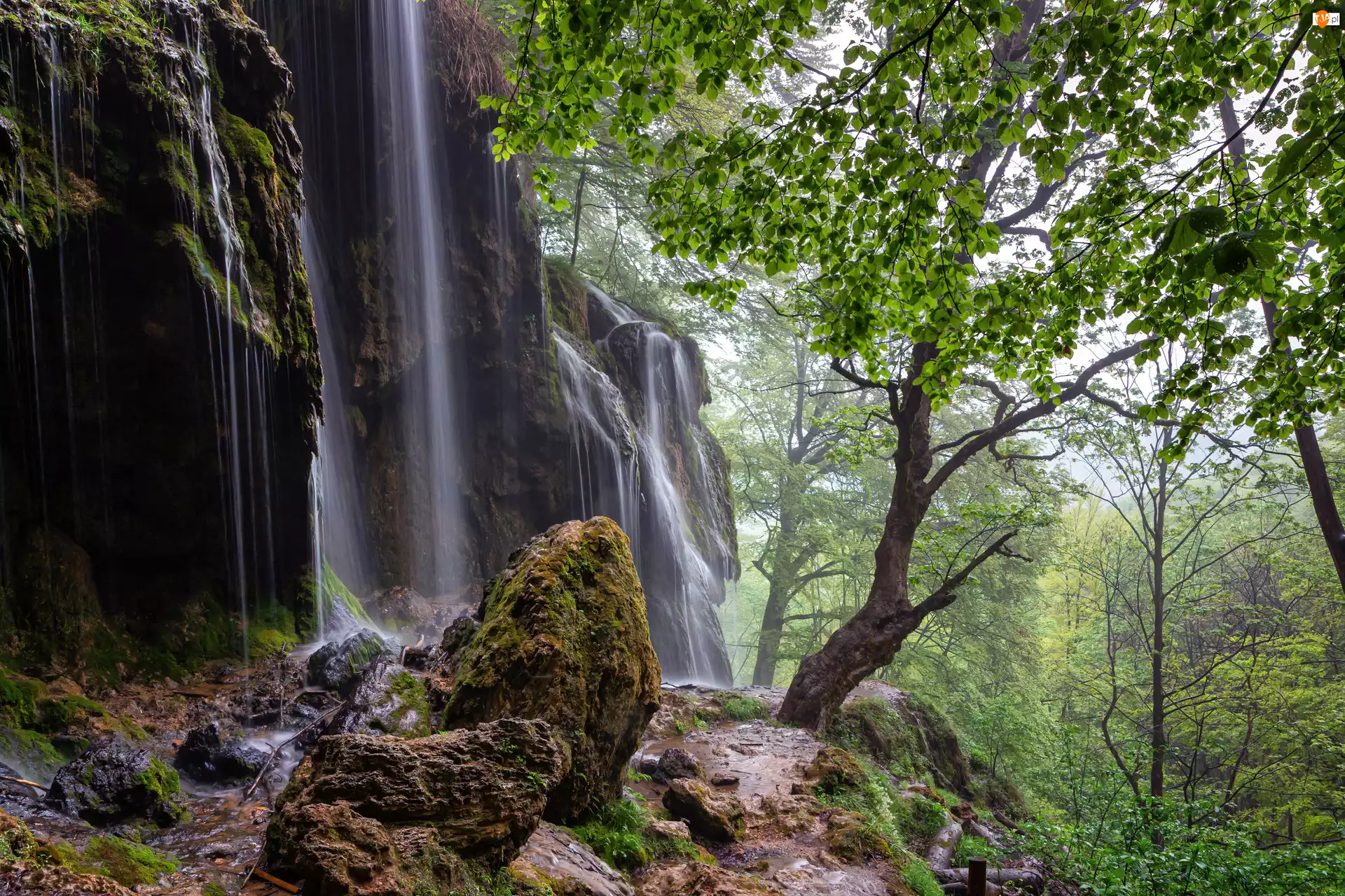Omszałe, Wodospad, Kamienie, Drzewa, Skały, Las