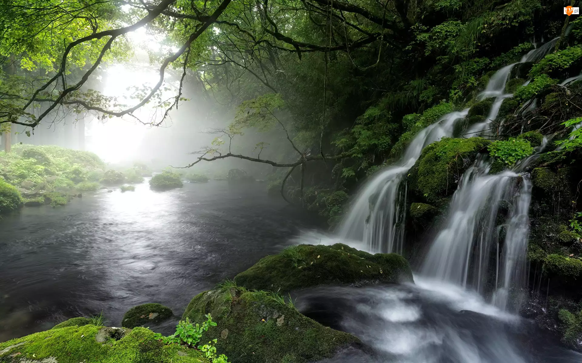 Omszałe, Wodospad, Mgła, Gałęzie, Kamienie, Drzewa