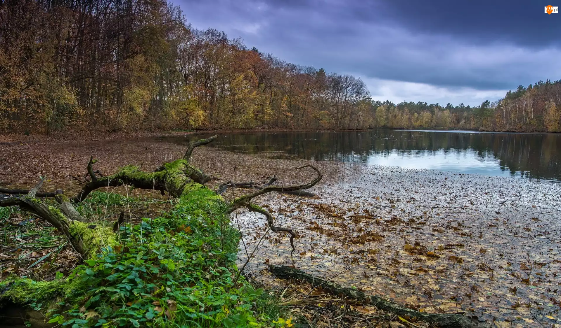 Drzewa, Omszały, Jesień, Jezioro, Liście, Konar, Powalony