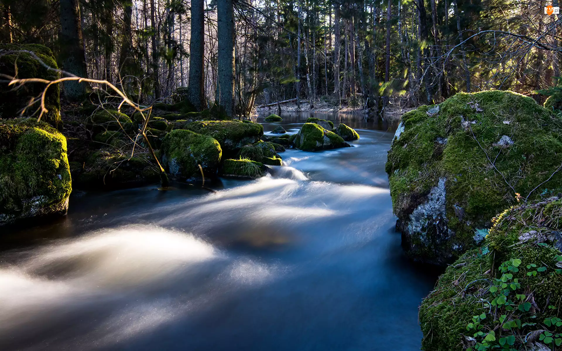 Omszone, Drzewa, Rzeka, Las, Kamienie