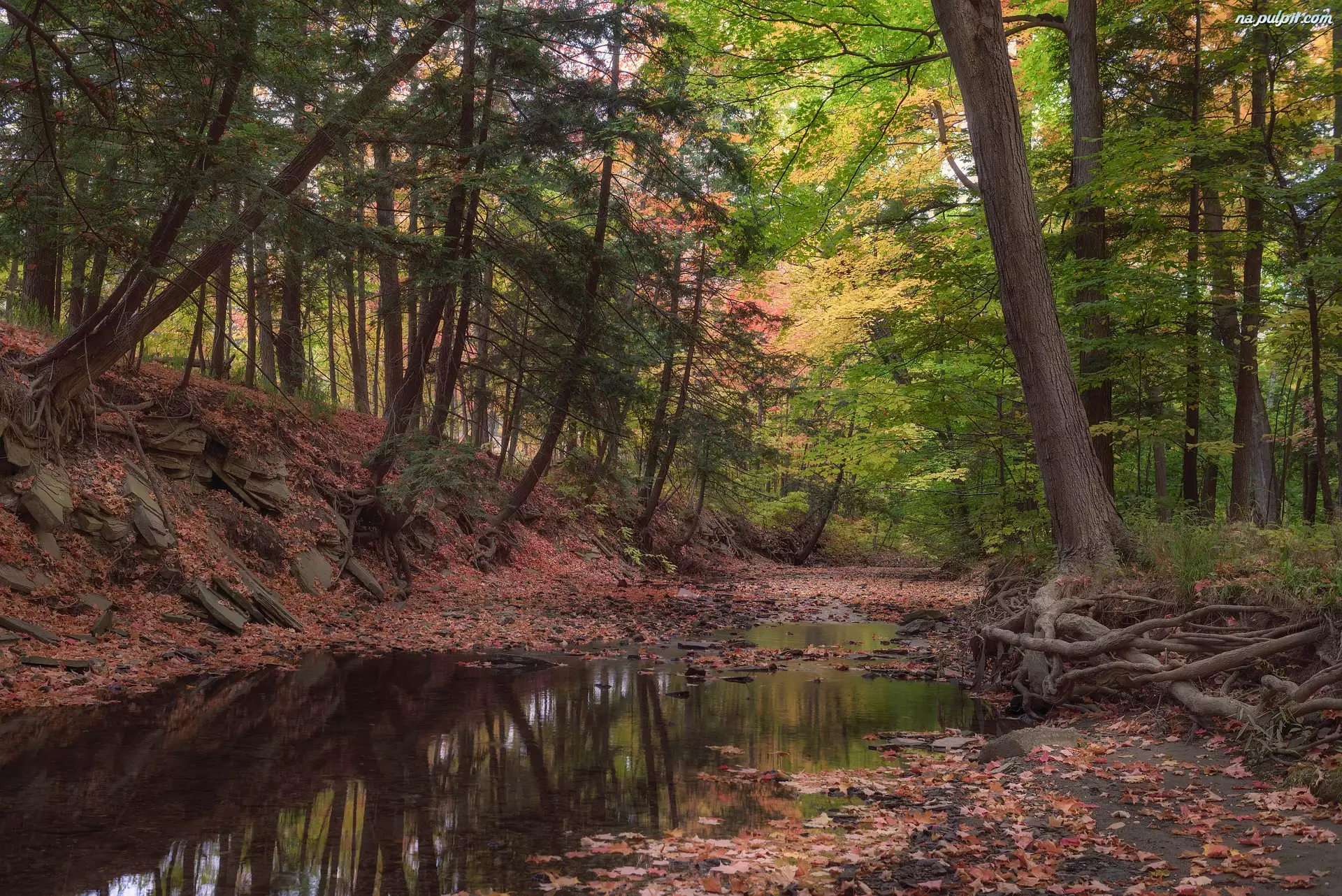 Las, Jesień, Opadłe, Kałuża, Drzewa, Liście