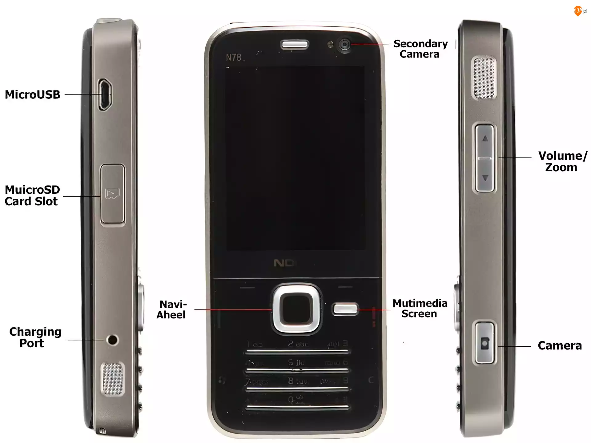 Opis, Nokia N78, Przód, Czarna, Boki