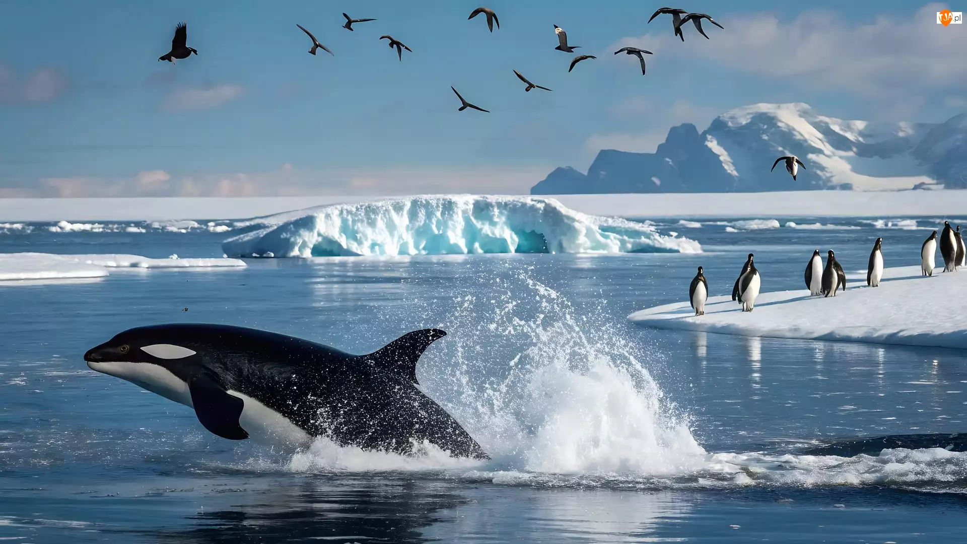 Orka, Pingwiny, Góry, Zima, Morze, Ptaki