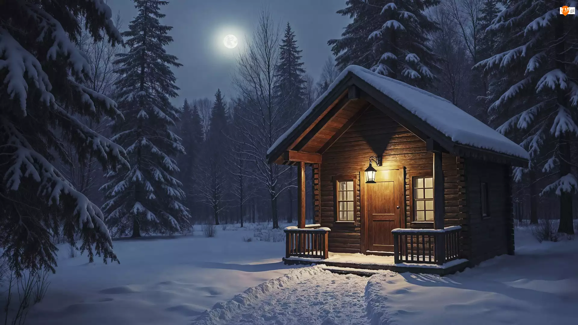 Dom, Zima, Noc, Drzewa, Las, Księżyc