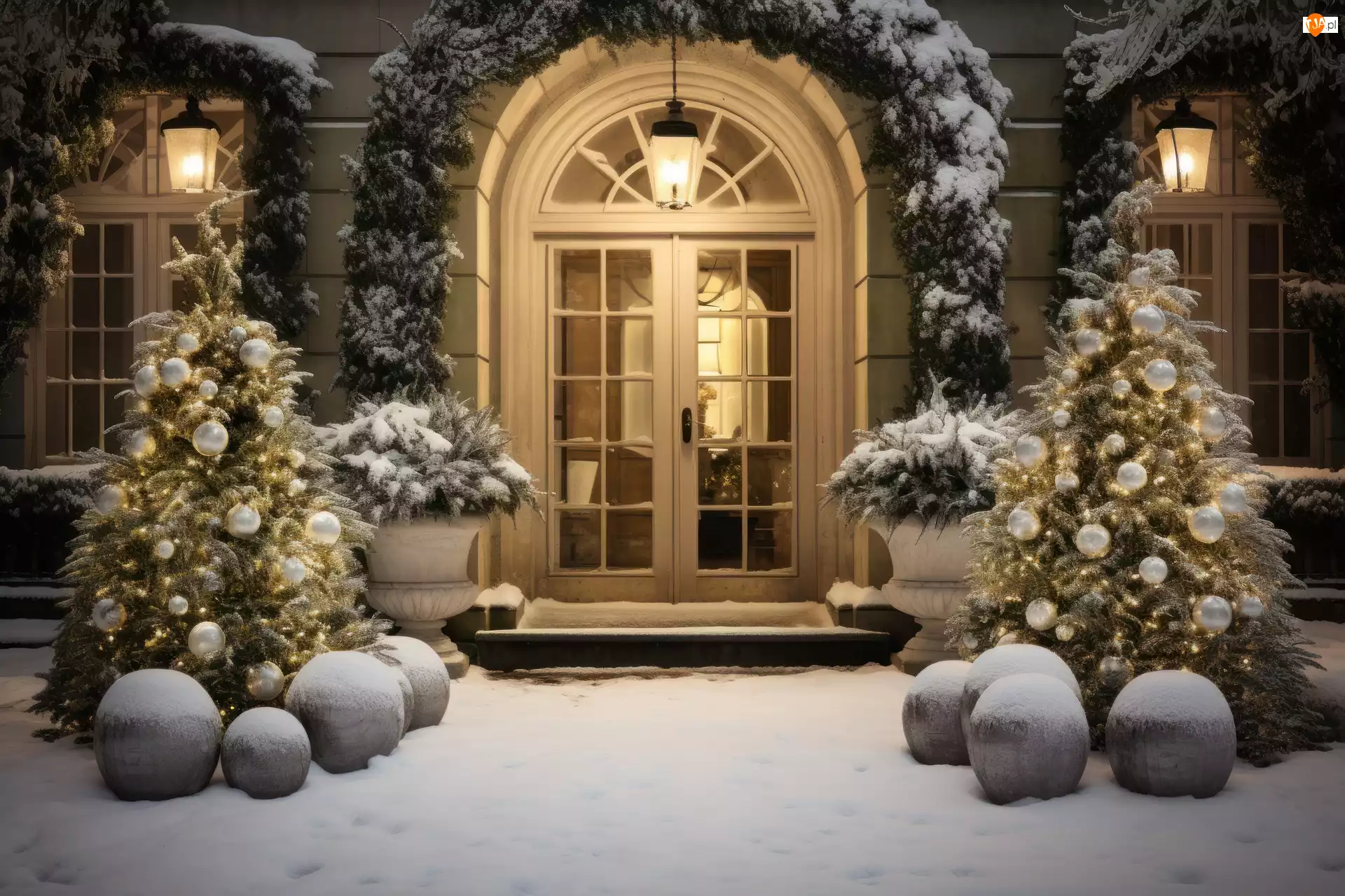 Ośnieżone choinki i girlandy przed wejściem do