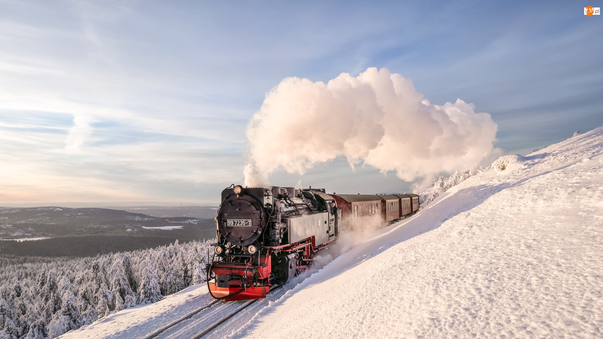 Ośnieżone, Drzewa, Chmury, Zima, Dym, Lokomotywa parowa, Pociąg