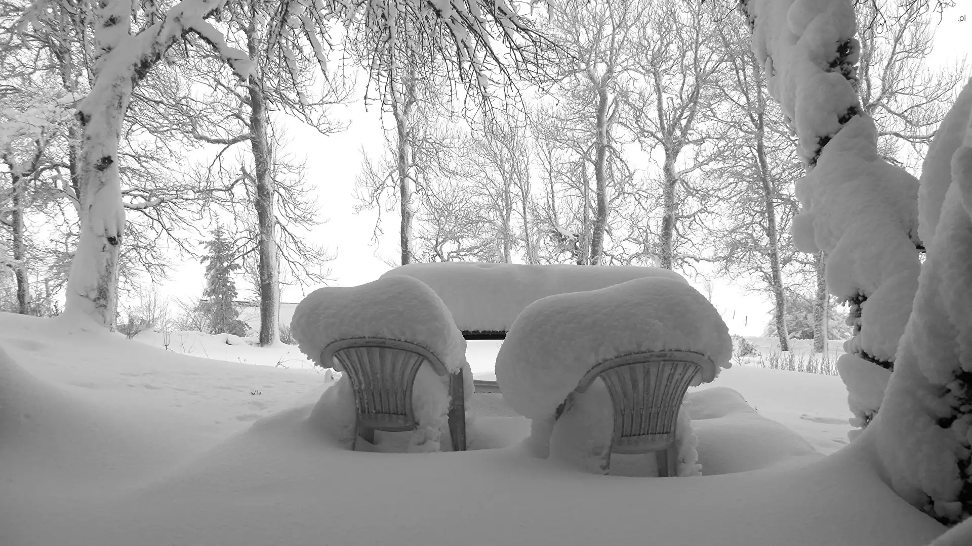 Drzewa, Krzesła, Śnieg, Zima, Zaśnieżone