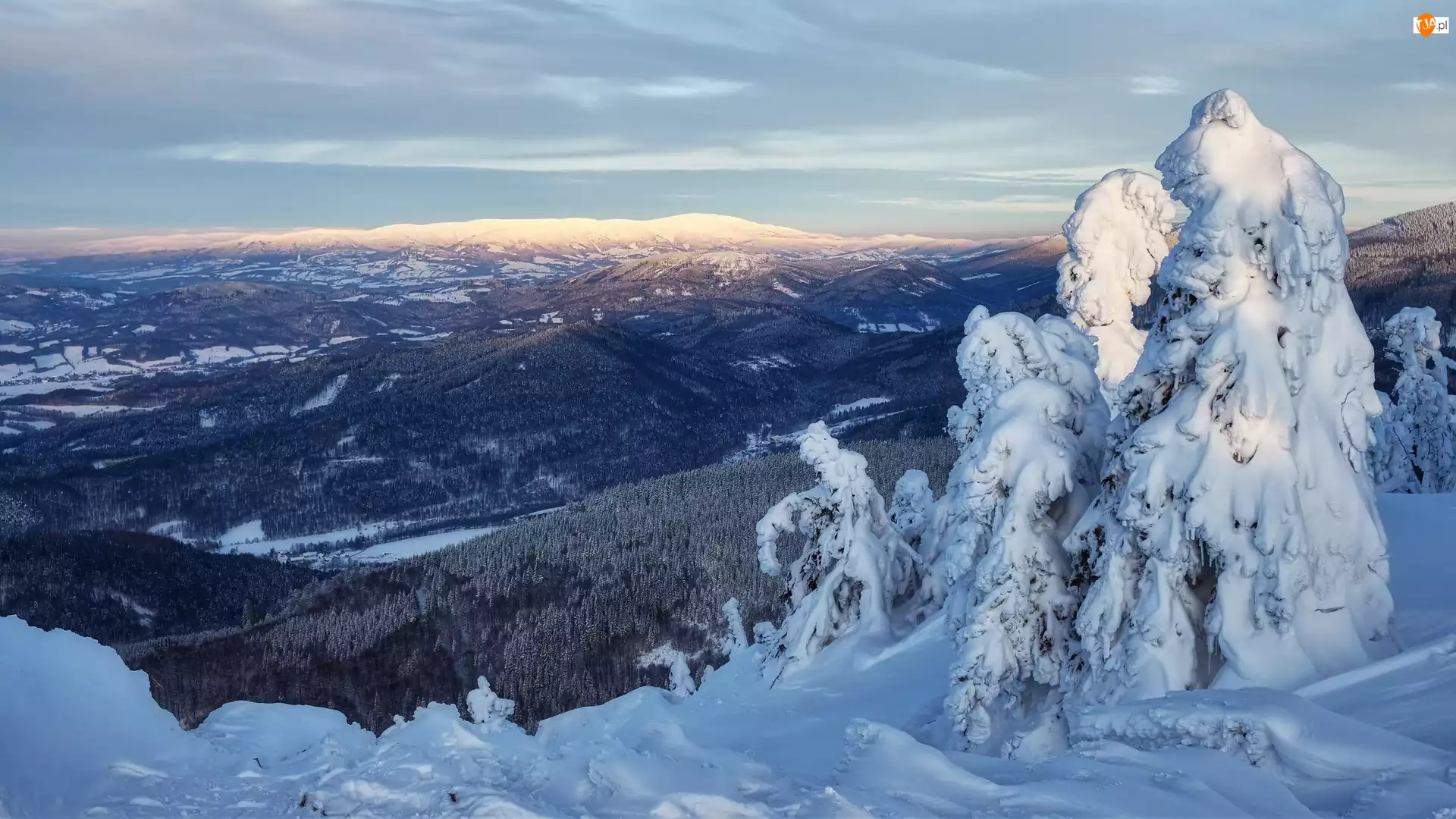 Kraj ołomuniecki, Góry, Drzewa, Czechy, Ośnieżone, Zima, Jesioniki