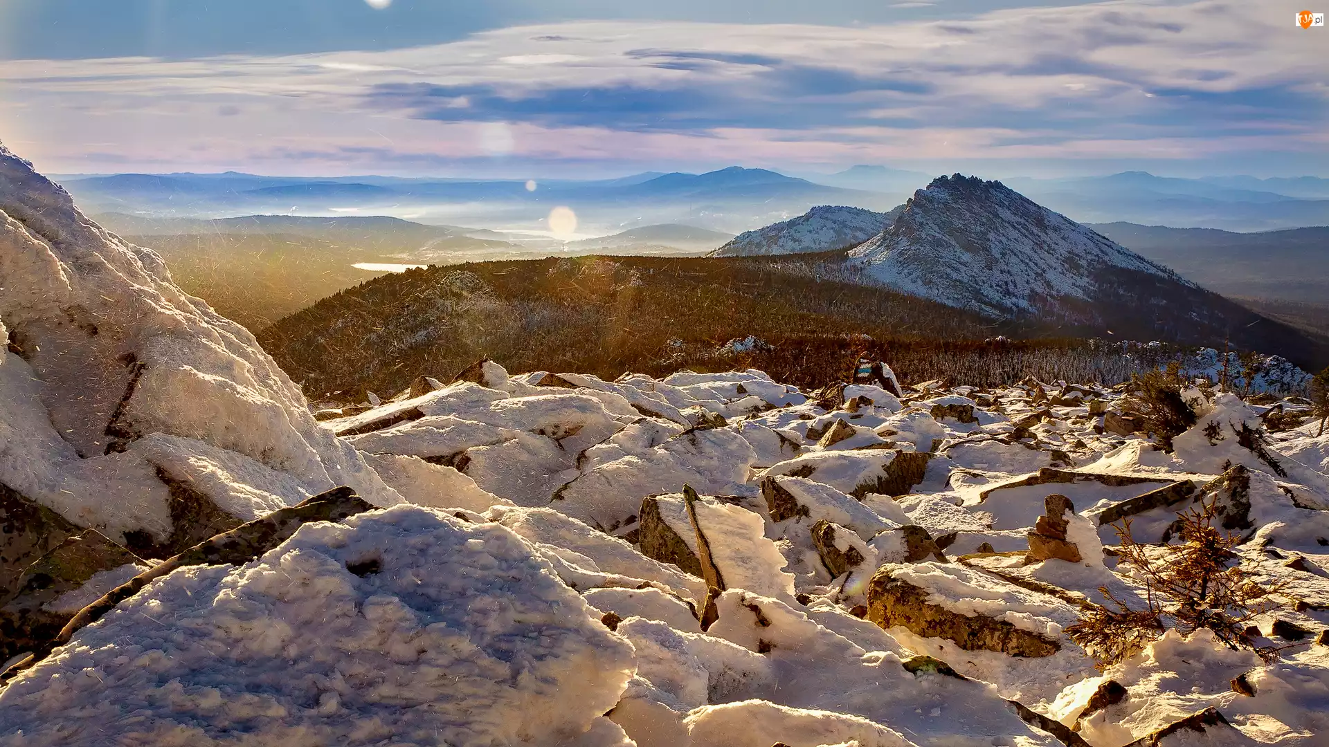 Rosja, Góra Otkliknoi Greben, Obwód czelabiński, Ośnieżone, Skały, Południowy Ural, Park Narodowy Taganaj, Góry Taganaj, Zima