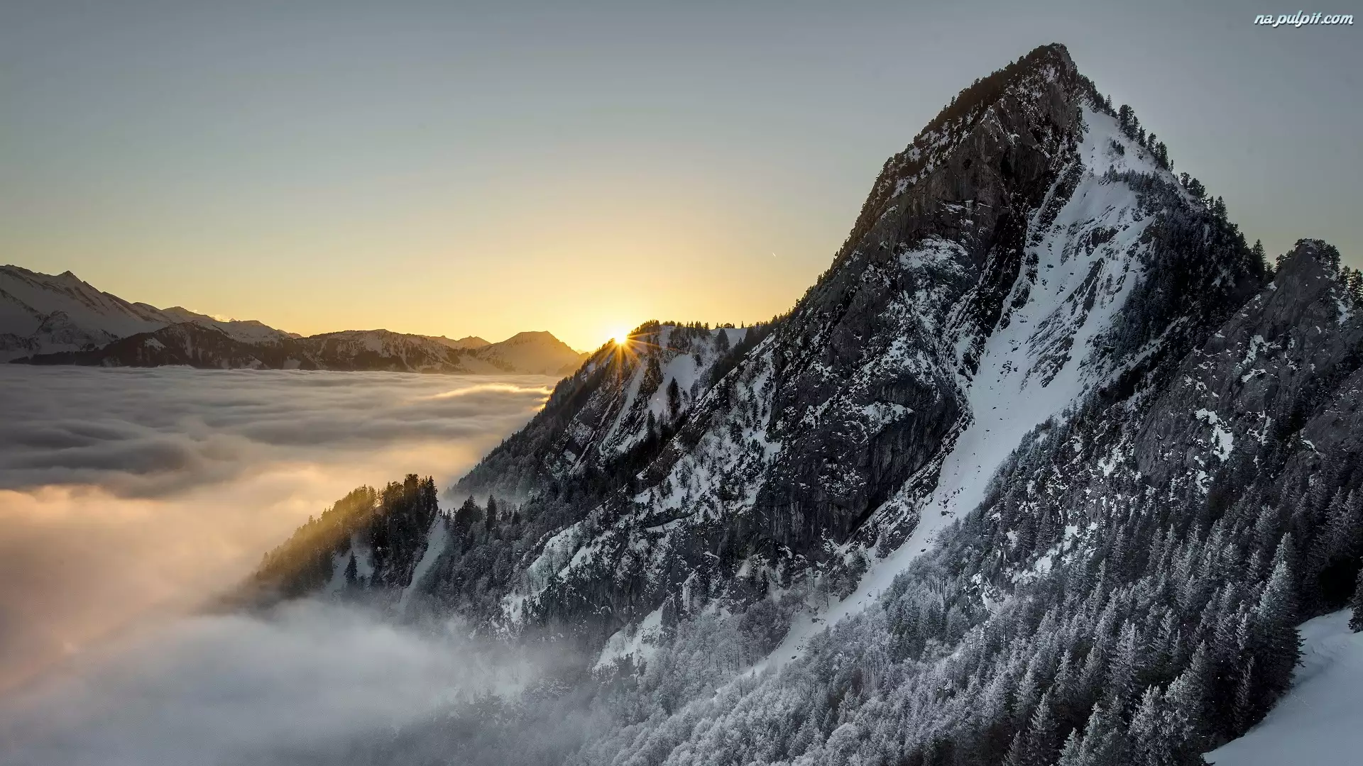 Ośnieżone, Mgła, Góry, Wschód słońca