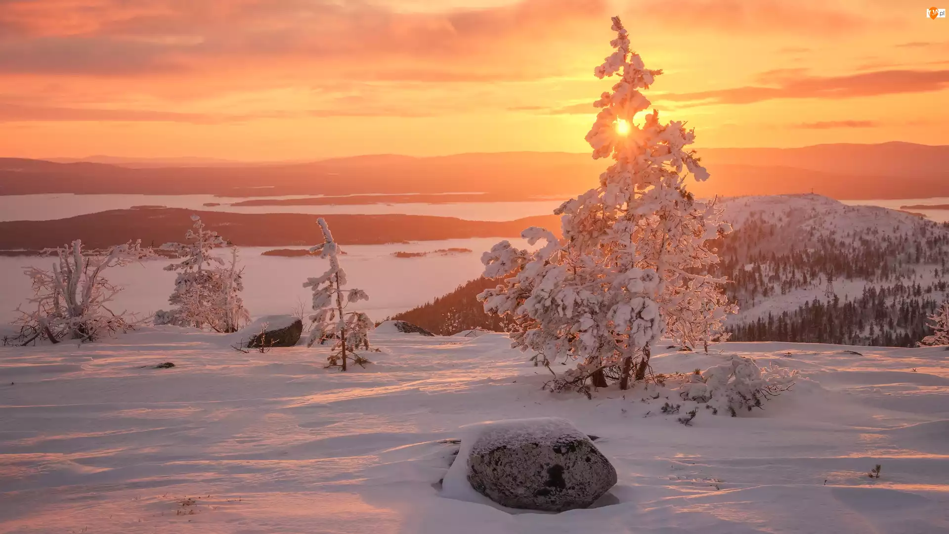 Ośnieżone, Zachód słońca, Zima, Drzewa