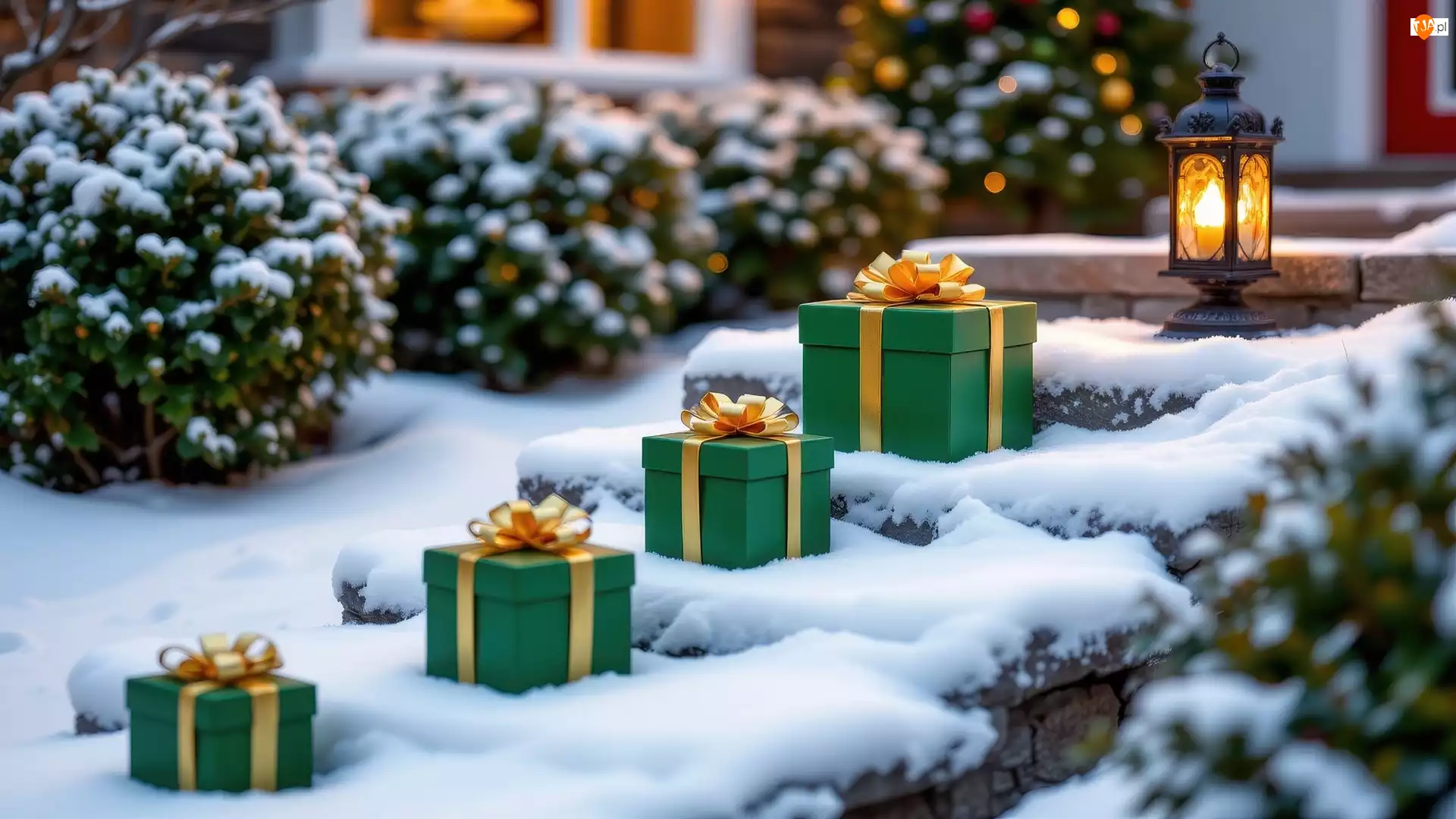 Ośnieżone, Zima, Krzewy, Lampion, Schody, Prezenty
