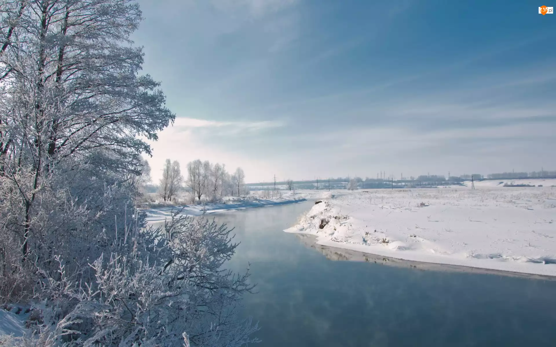 Ośnieżone, Zima, Rzeka, Niebo, Drzewa, Pola
