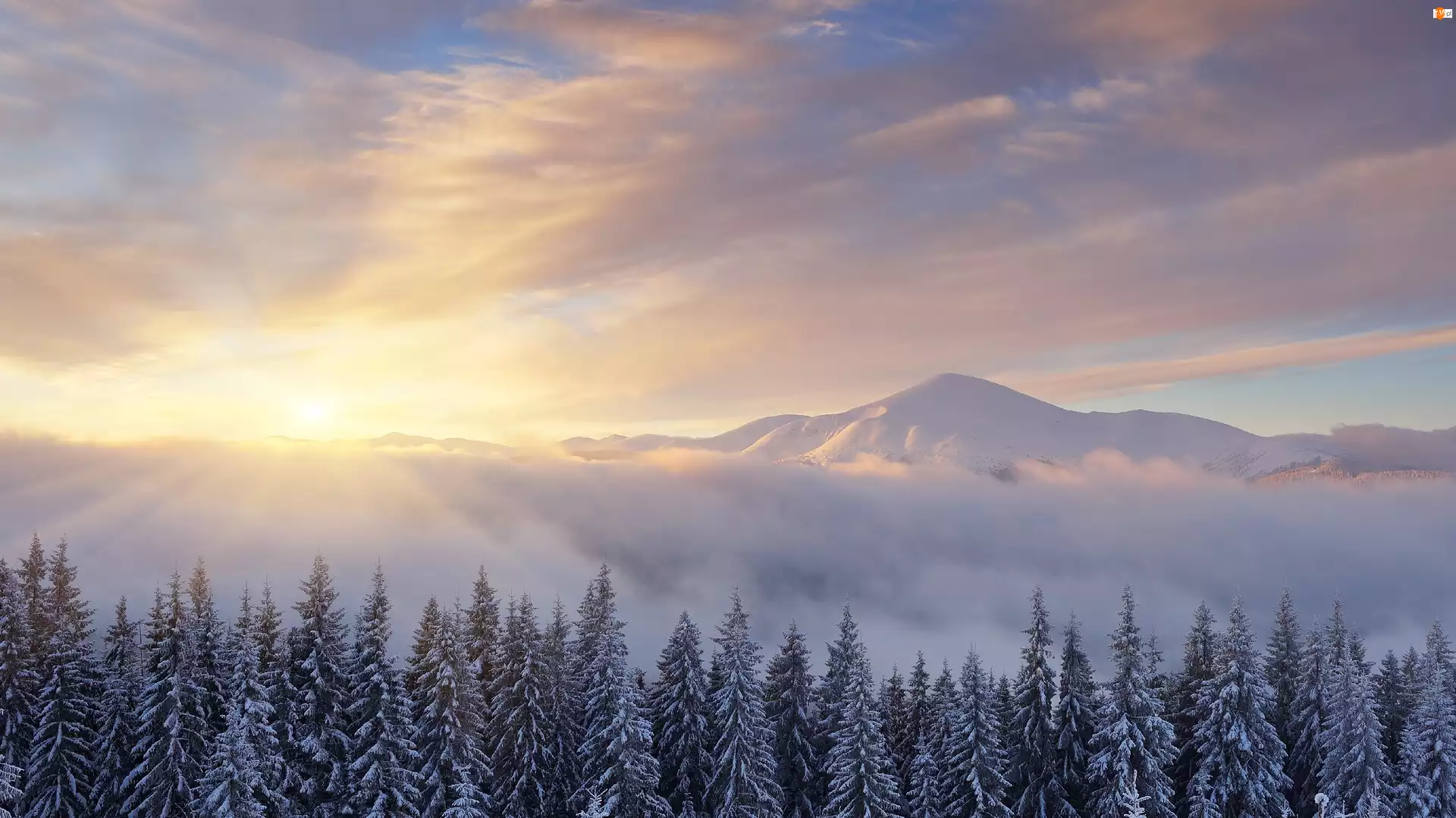Góry, Wchód słońca, Zima, Mgła