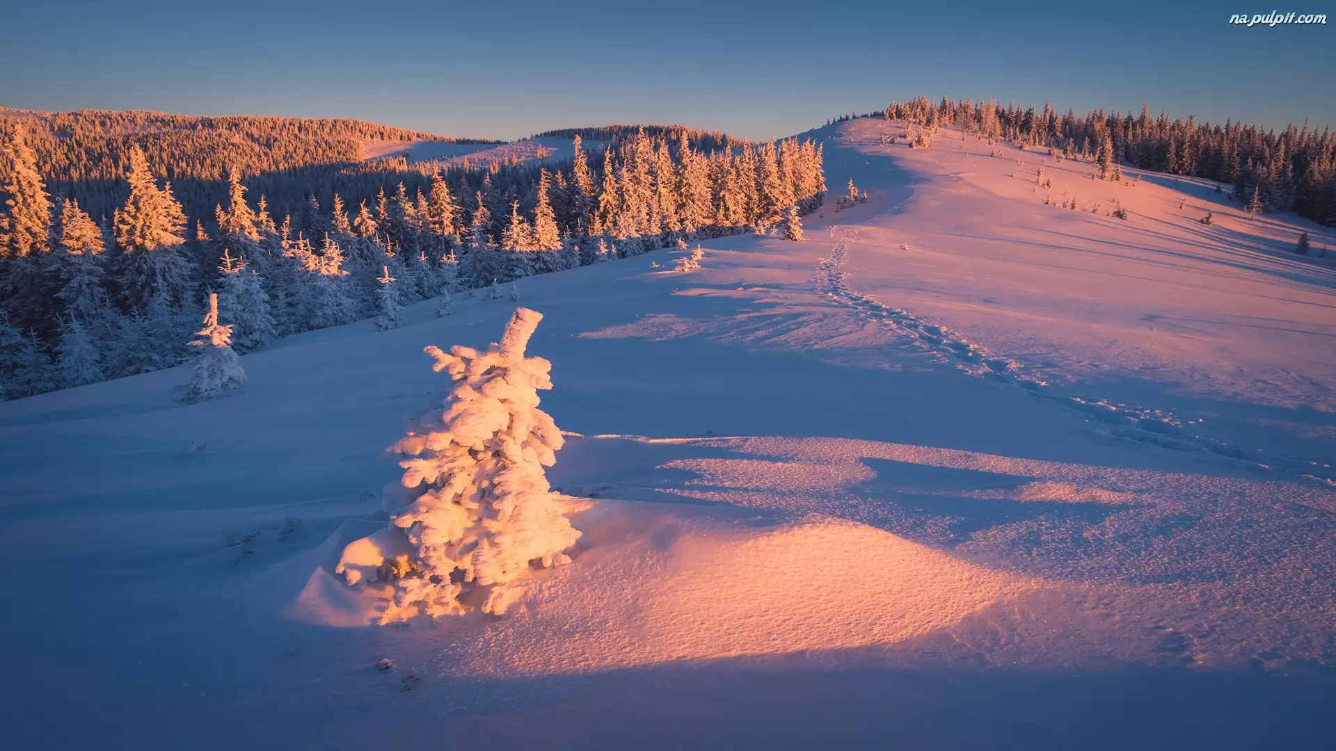 Wzgórze, Zima, Ośnieżone, Drzewa, Las, Świerki