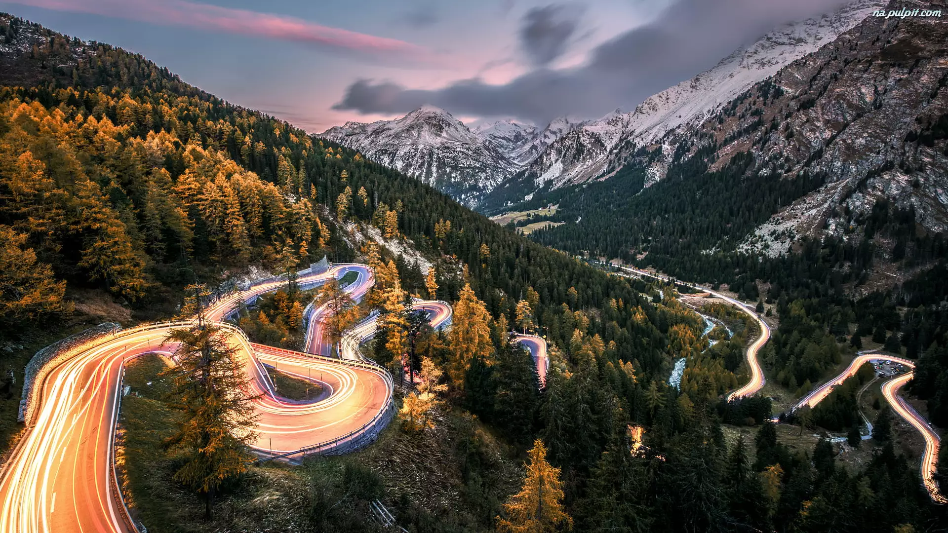 Oświetlona kręta droga na przełęczy Maloja