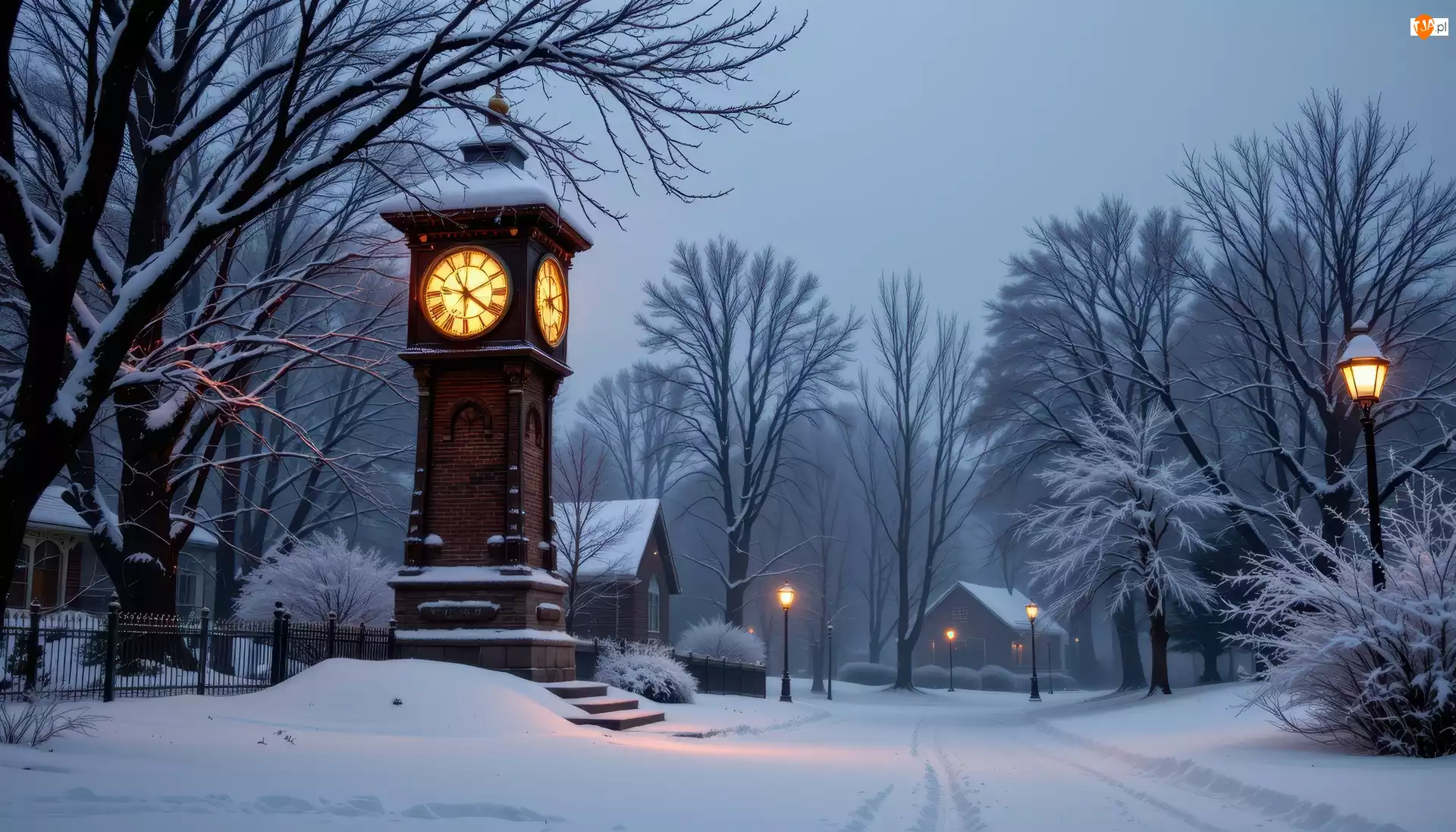 Park, Zima, Wieża, Zegar, Latarnie, Drzewa