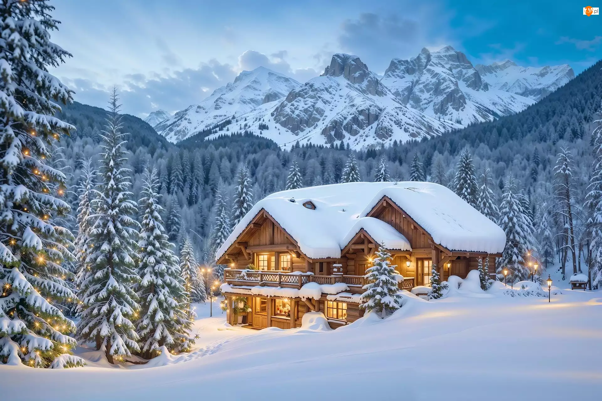 Oświetlony, Dom, Grafika, Zima, Las, Drzewa, Góry