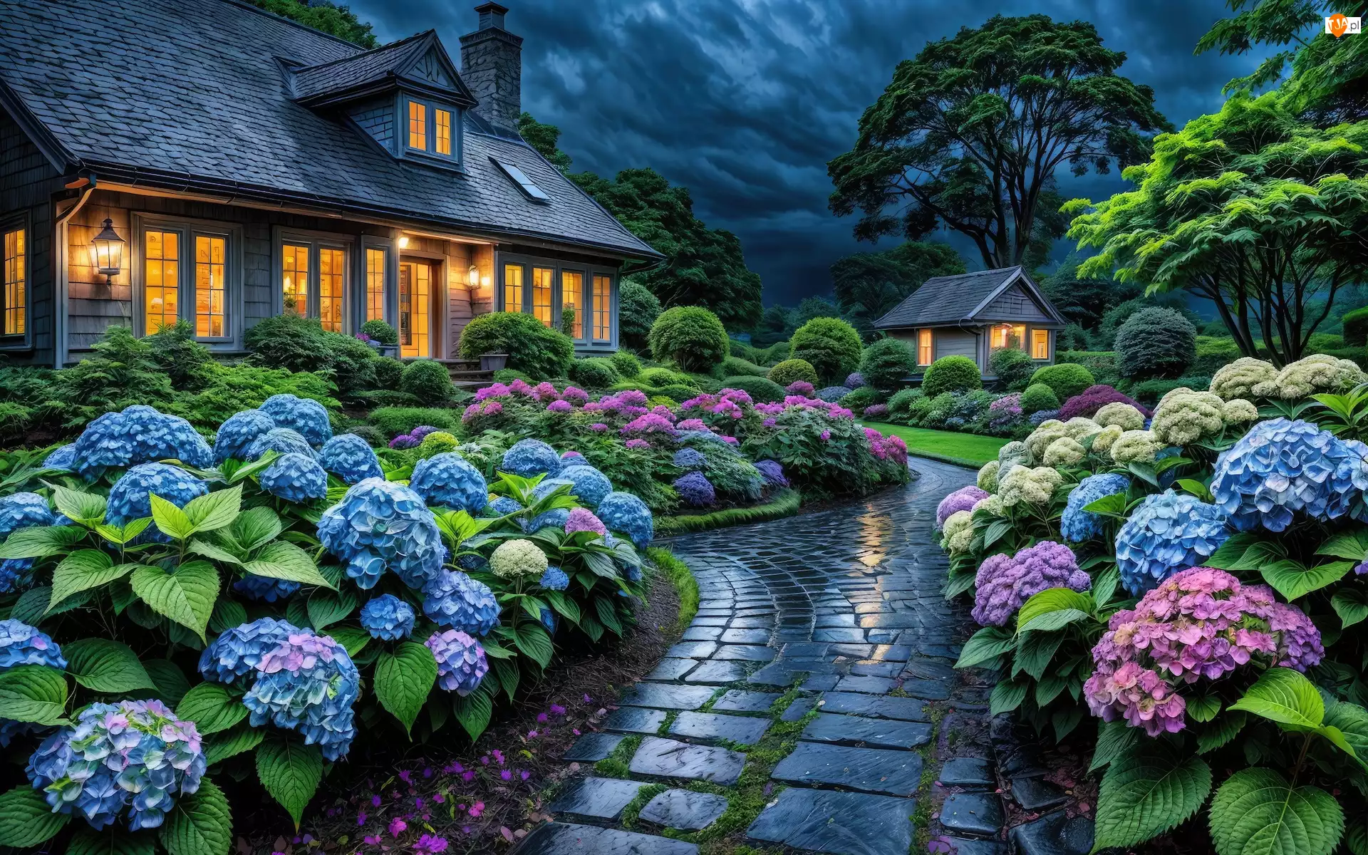 Oświetlony, Kwiaty, Chmury, Dom, Drzewa, Chodnik, Hortensje