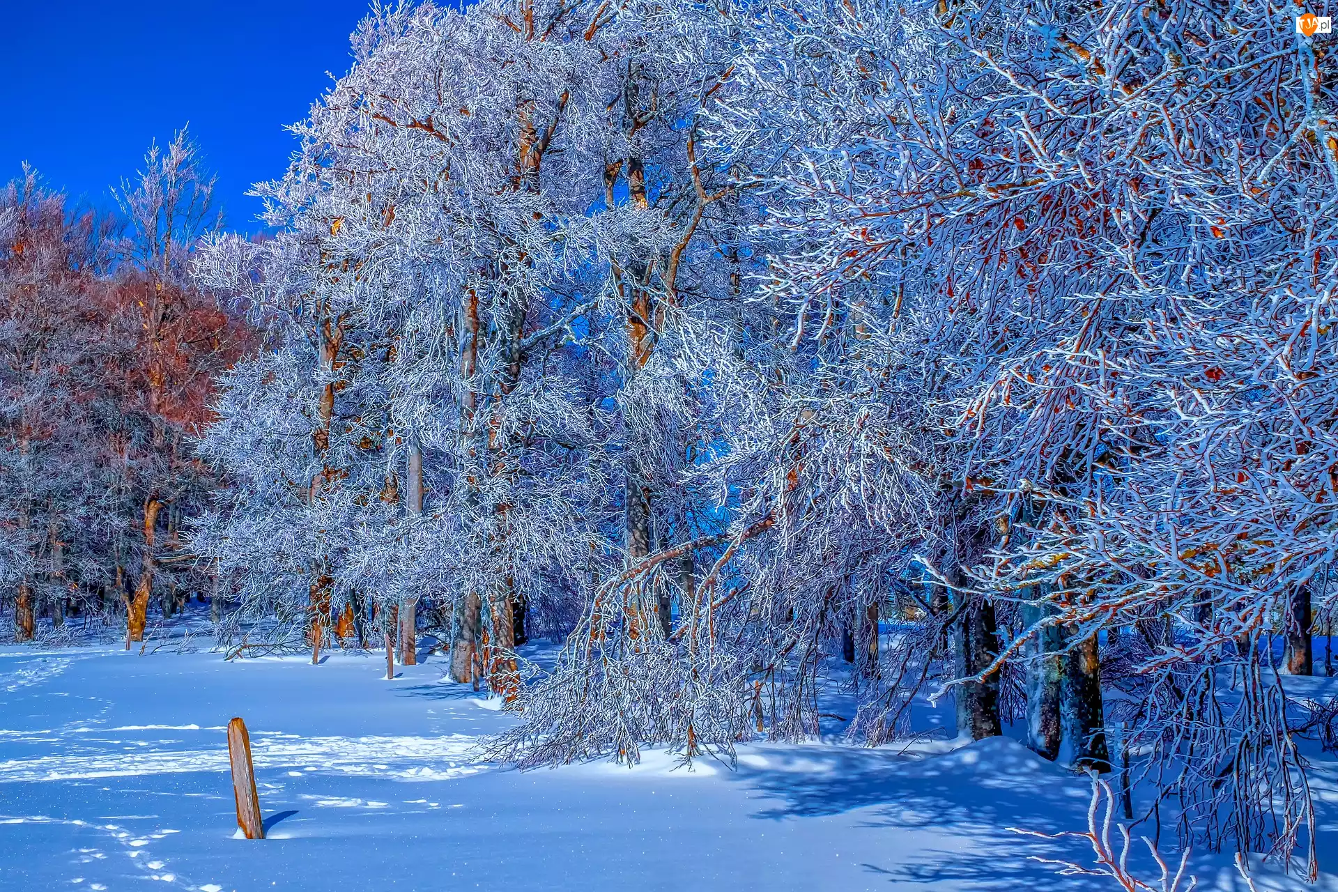 Dzień, Las, Słoneczny, Oszronione, Drzewa, Śnieg, Szron, Zima, Ośnieżone