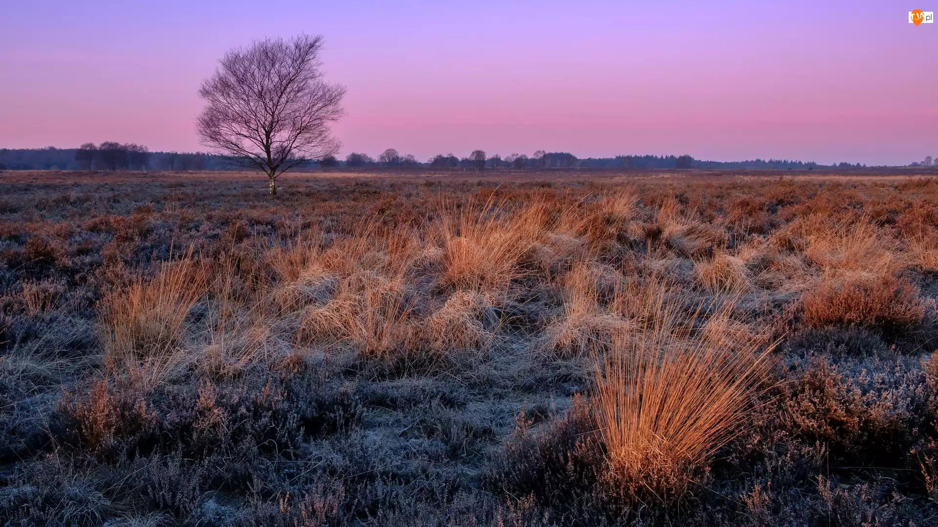 Łąki, Kępki, Wschód słońca, Pola, Drzewo, Szron, Traw