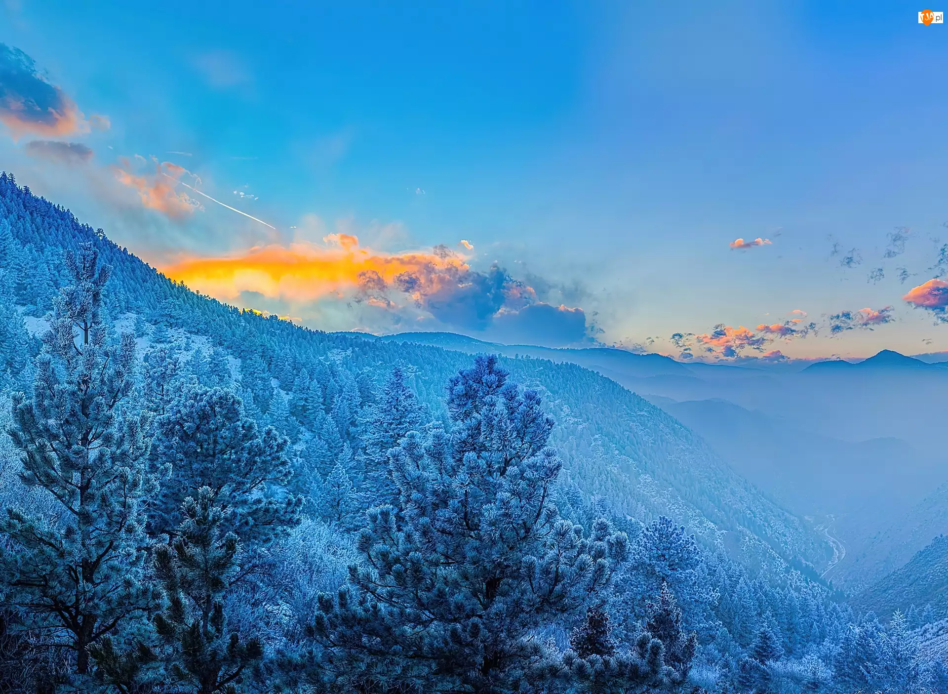 Oszronione, Niebo, Las, Góry, Drzewa, Mgła, Chmu