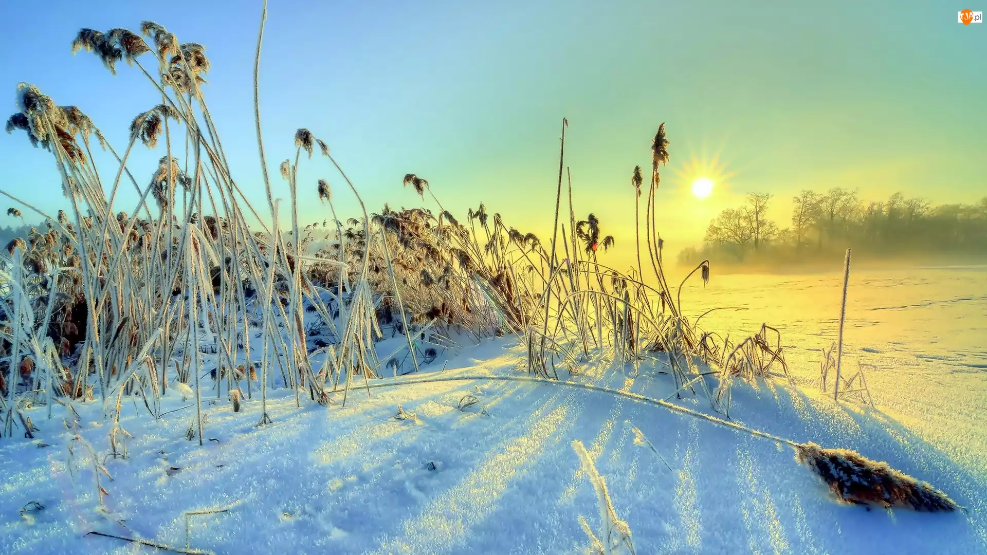 Trawy, Zima, Rzeka, Mgła, Drzewa, Promienie słońca