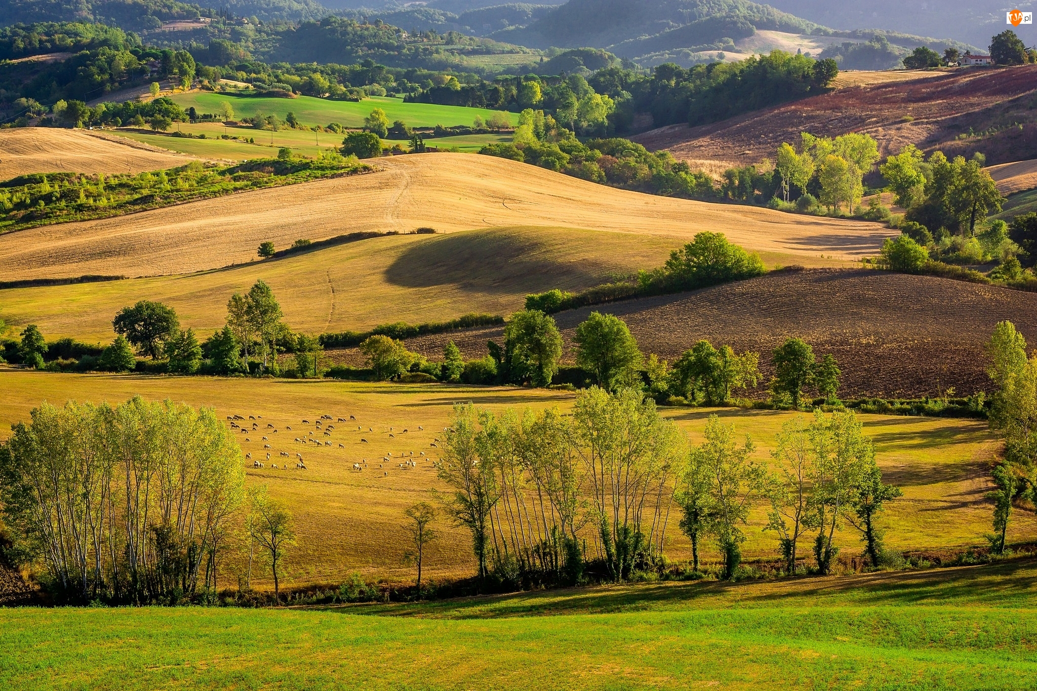Prowincja Siena, Wzgórza, Drzewa, Toskania, Pola, Owce, Włochy, Łąki