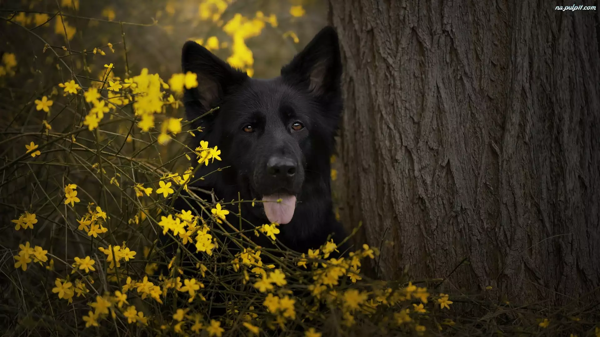 Mordka, Kwiaty, Czarny owczarek niemiecki, Pies, Drzewo