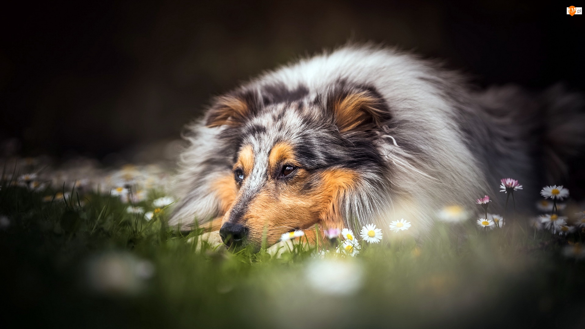 Leżący, Kwiaty, Owczarek szkocki długowłosy, Łąka