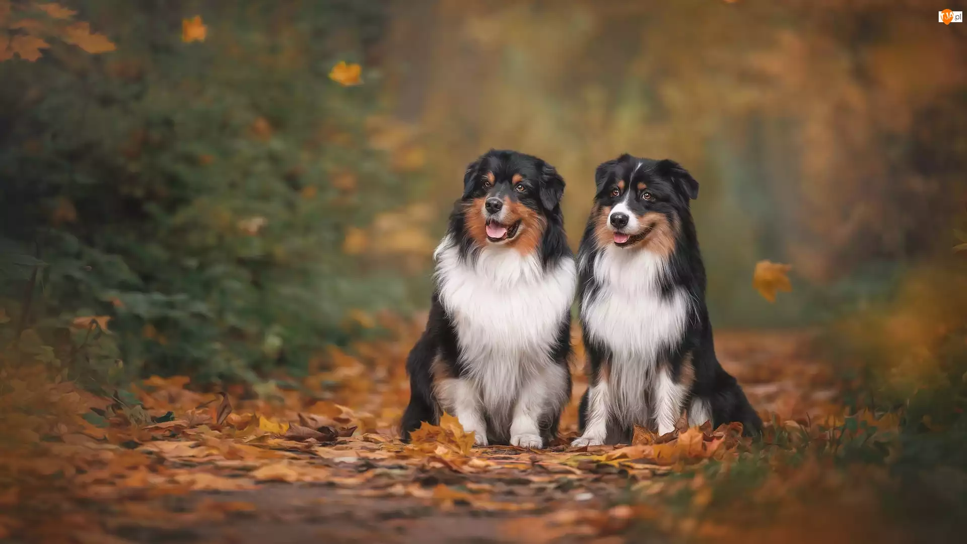 Owczarki australijskie, Suche, Dwa, Psy, Liście