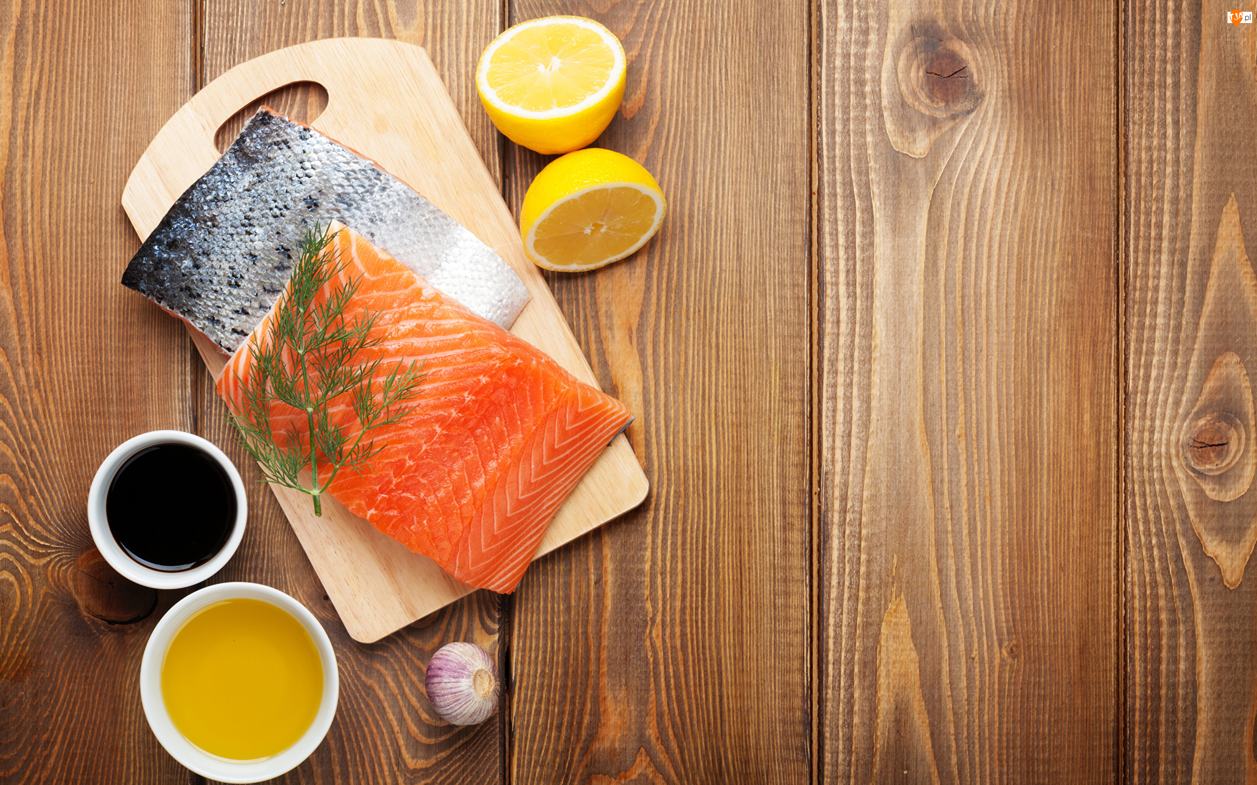 Koperek, Ryba, Cytryna, Sos, Kawałki, Czosnek, Deski, Łosoś