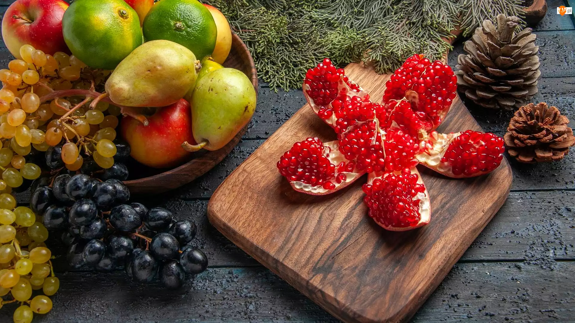 Gałązki, Deska, Granat, Winogrona, Owoce, Miska, Jabłka, Limonki, Gruszki, Szyszki