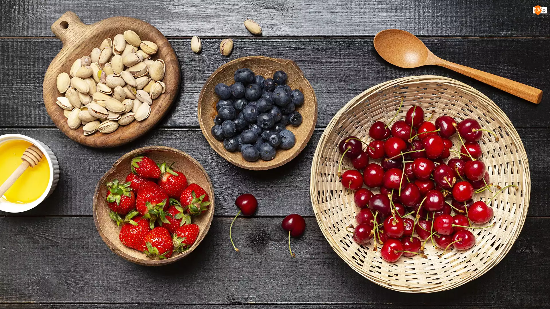 Deski, Wiśnie, Łyżka, Orzechy, Miód, Truskawki, Jagody, Owoce, Miski