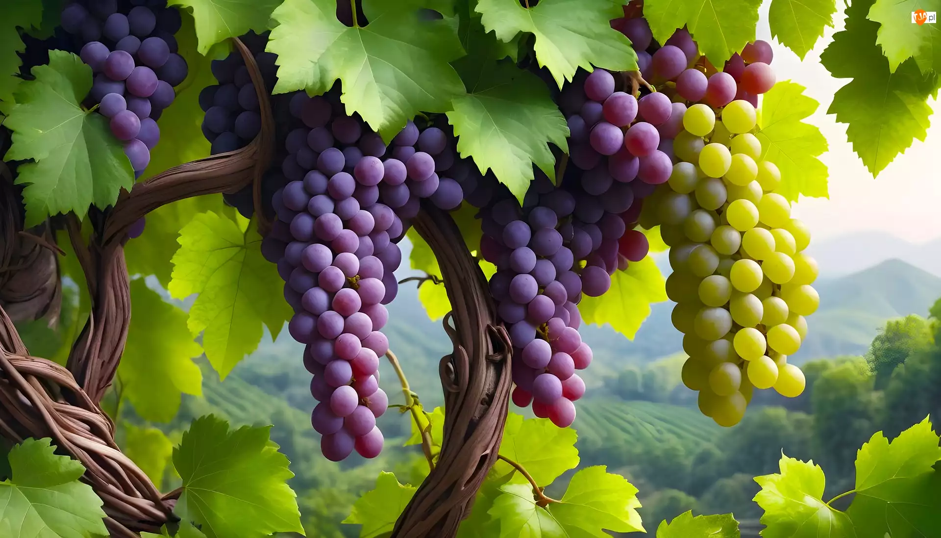 Owoce, Winogrona, Liście, Grafika, Gałęzie, Góry