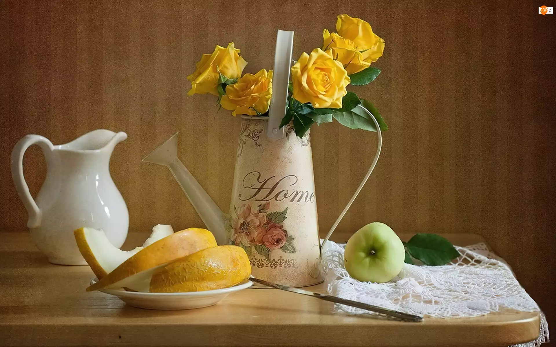 Dzbanek, Owoce, Róże, Żółte, Konewka