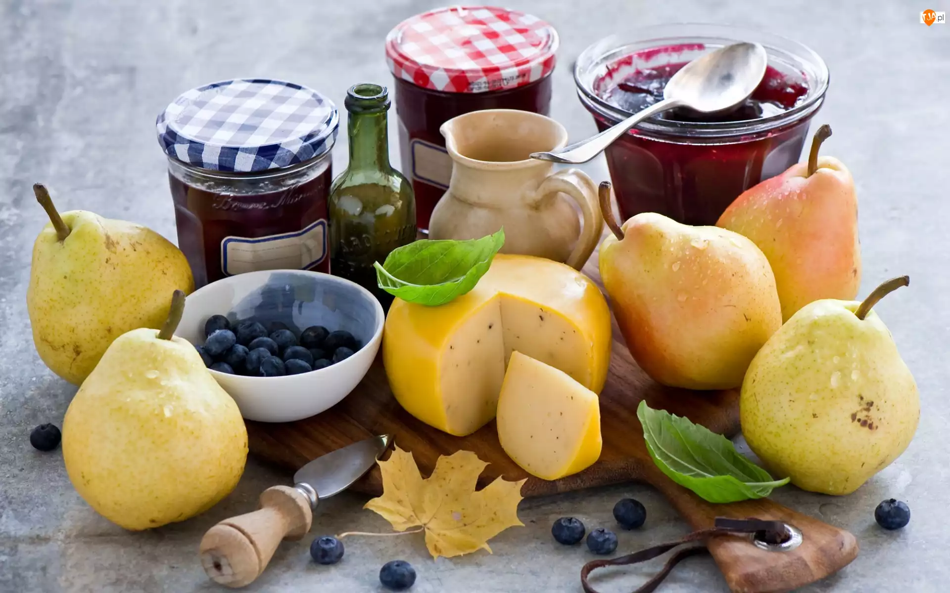 Słoiki, Dżemy, Borówki, Łyżeczka, Gruszki, Butelka, Kompozycja, Dzbanuszek, Sery, Deska