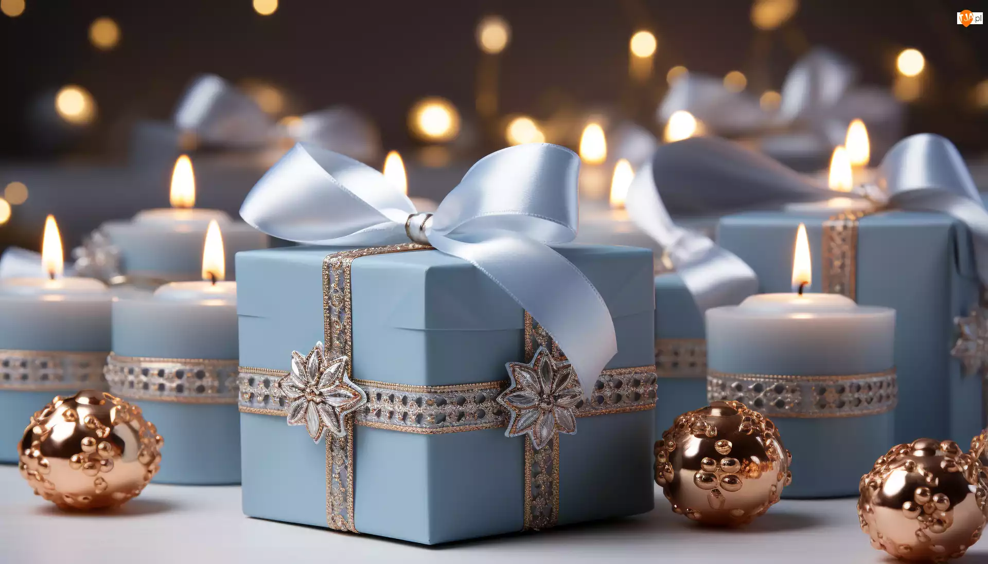 Ozdobne bombki obok prezentów z kokardami i płon