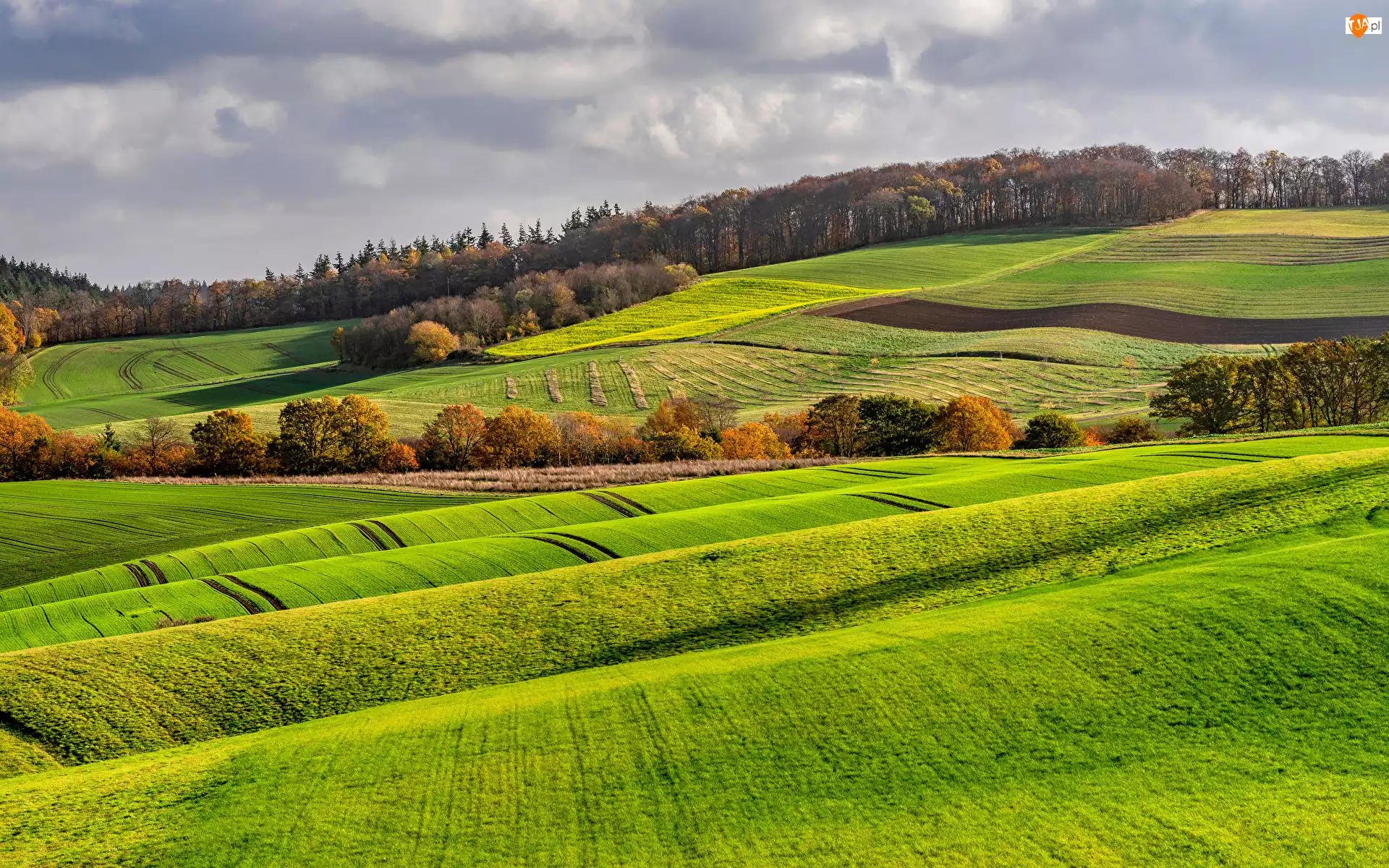 Pola, Wzgórza, Drzewa, Niebo, Uprawne, Las