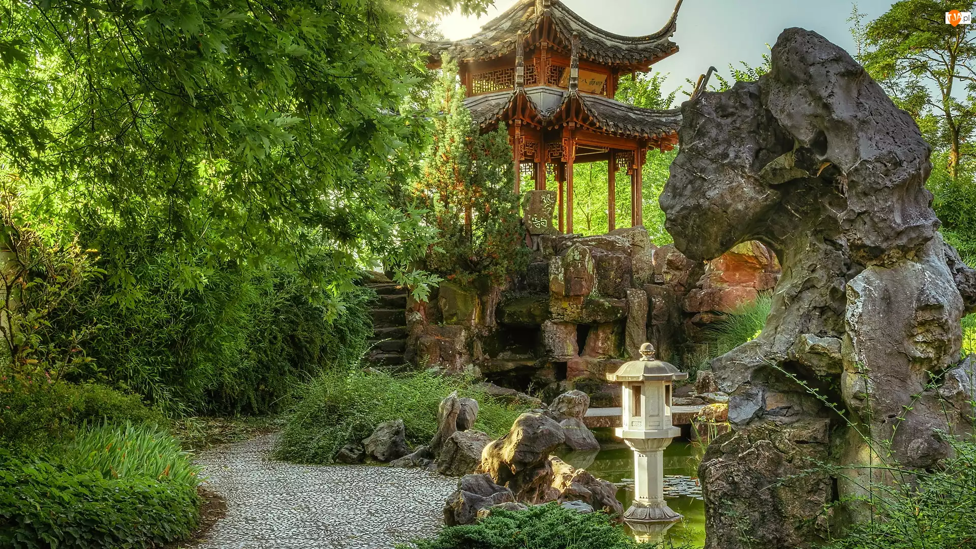 Stuttgart, Niemcy, Staw, Altana, Ogród chiński, Roślinność