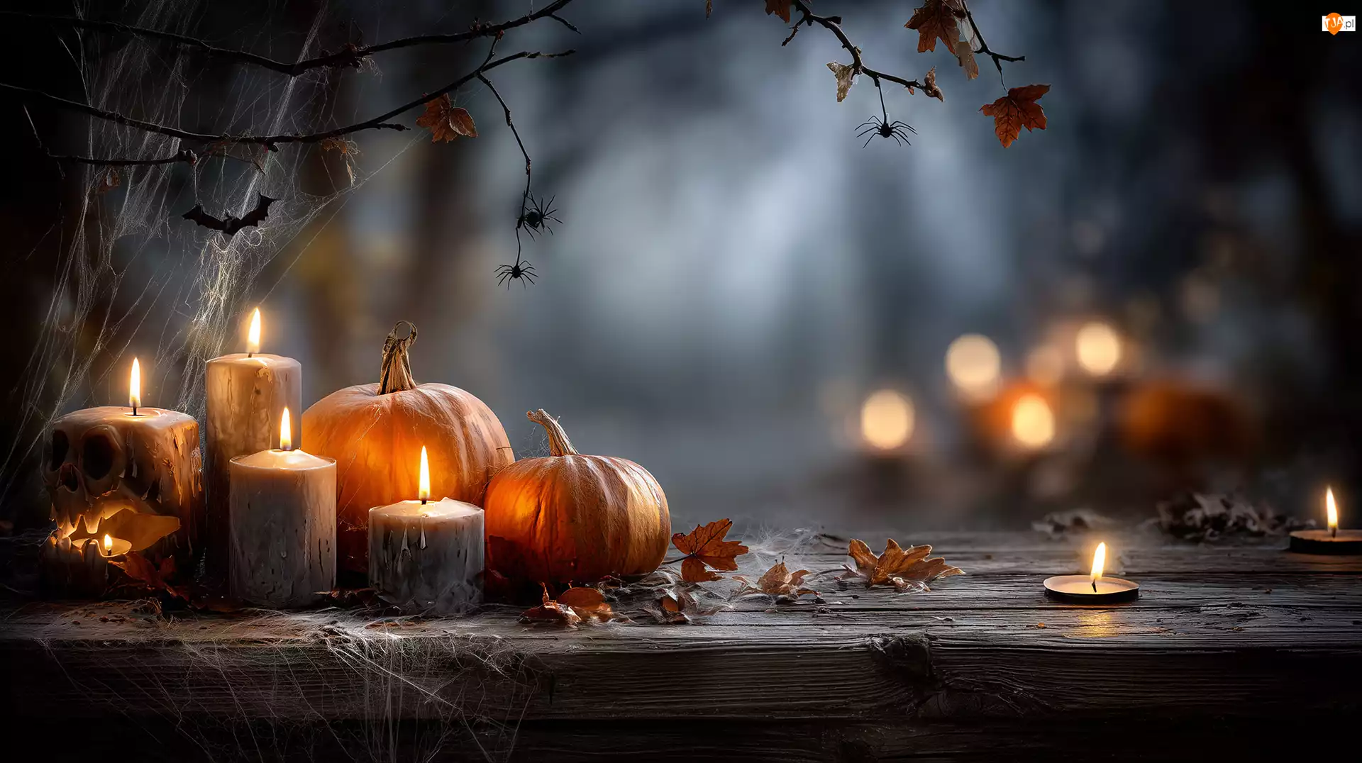 Pajęczyny, Grafika AI, Dynie, Świece, Halloween