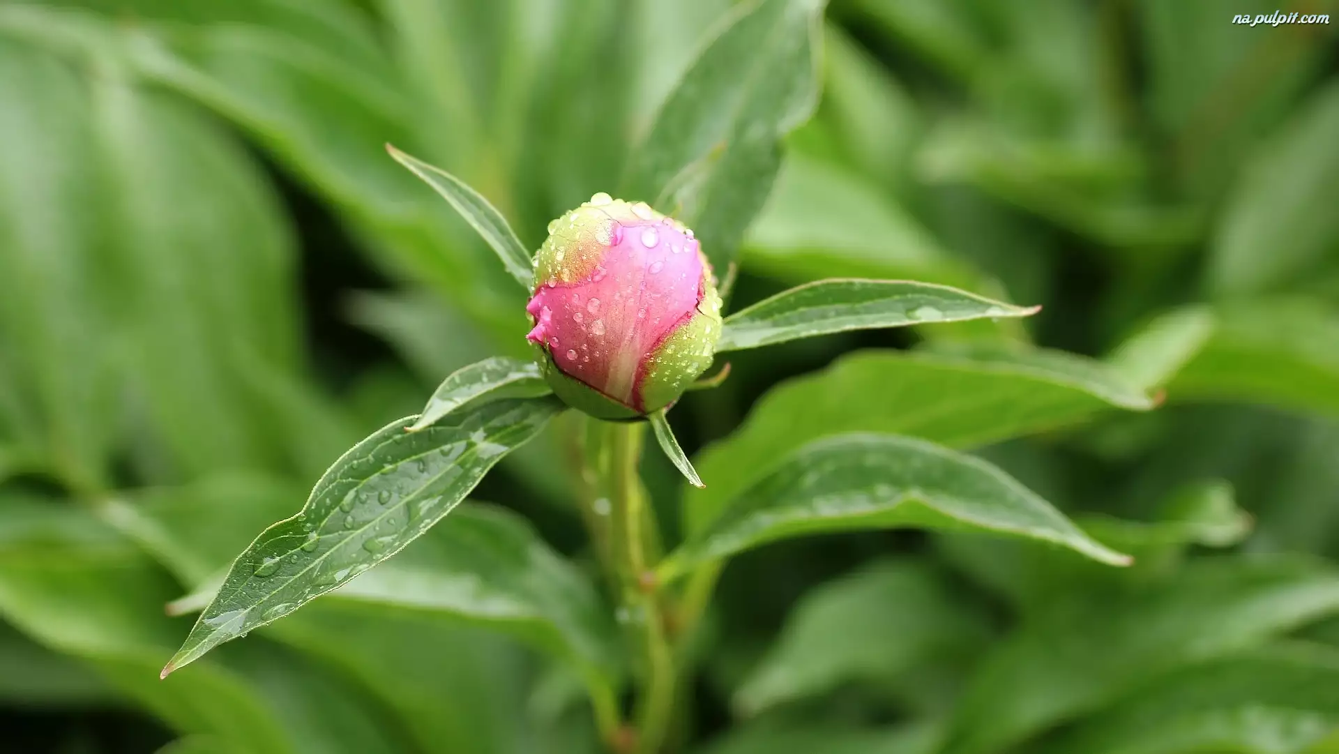 Piwonia, Kwiat, Liście, Wody, Pąk, Krople
