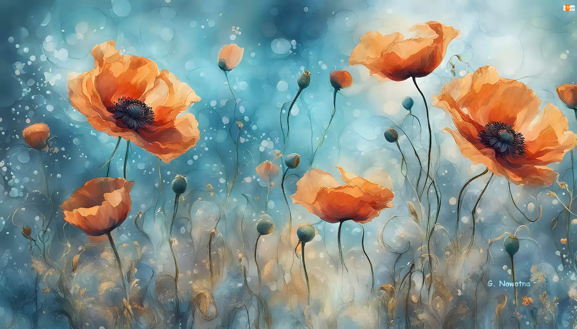 Grafika, Niebieskie, Kwiaty, Maki