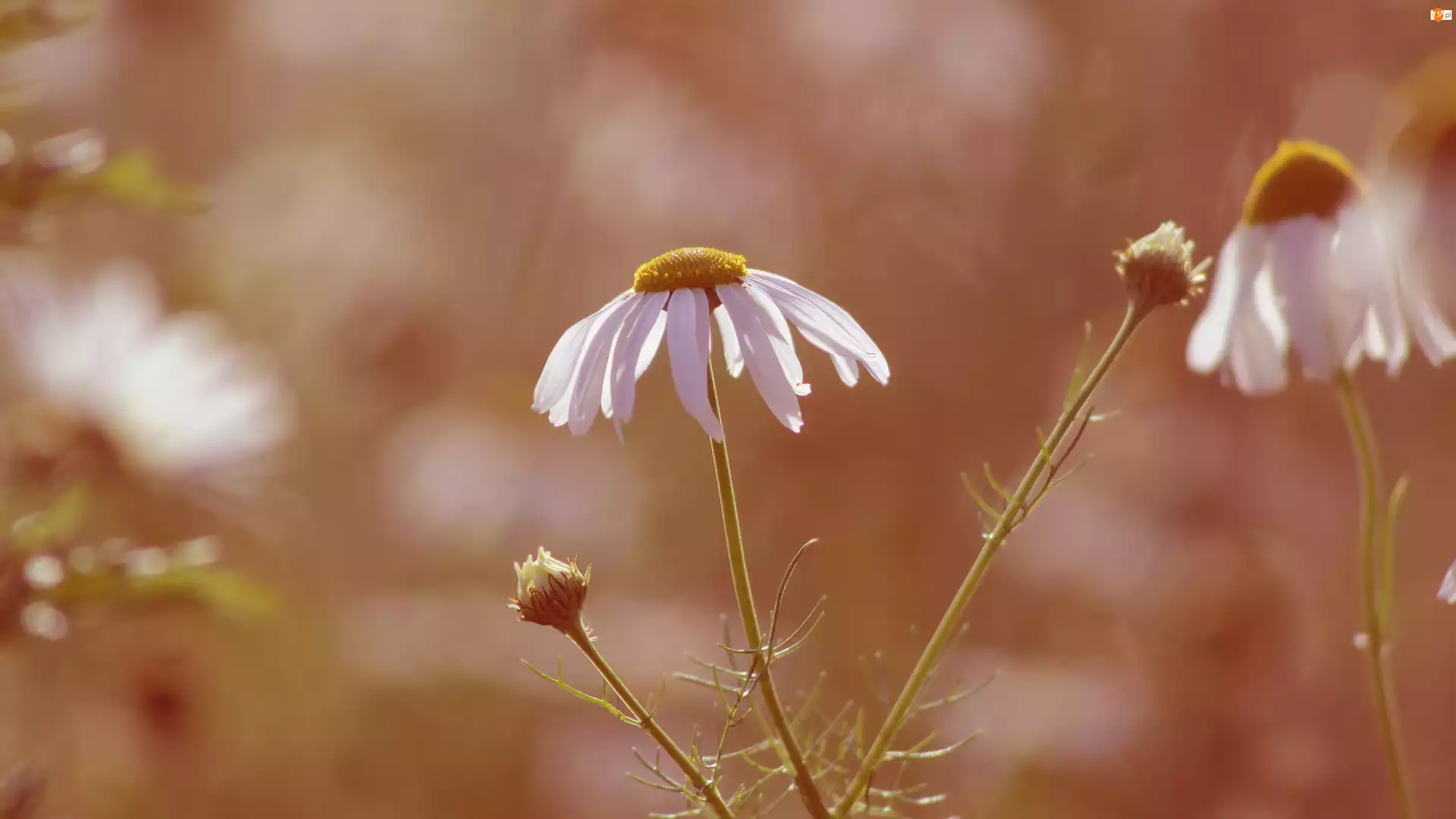 Pąki, Rozmyte tło, Rumianek, Kwitnący, Zbliżen