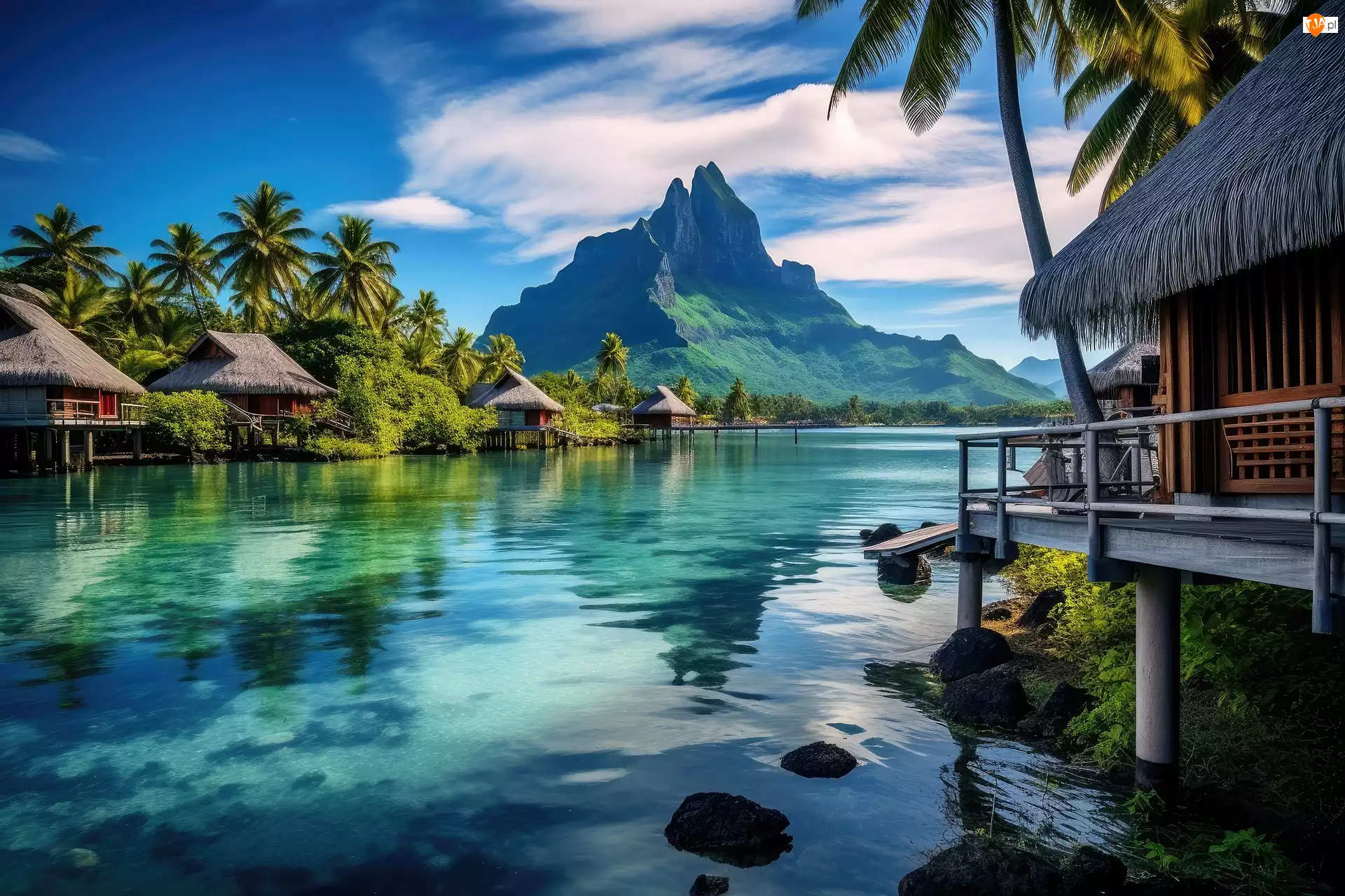 Palmy, Domki, Niebo, Rzeka, Góra, Grafika