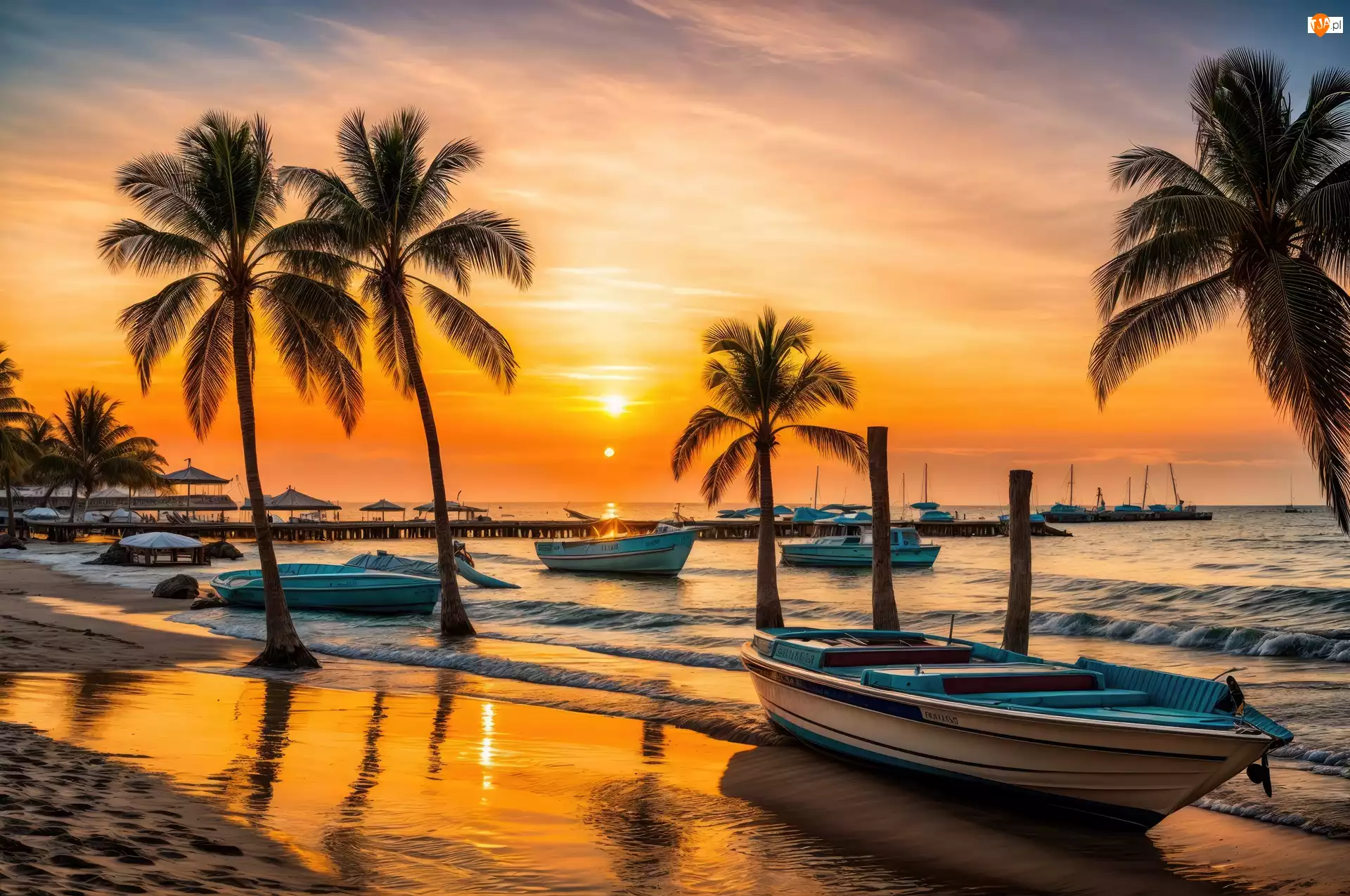 Palmy, Grafika, Łódki, Morze, Zachód słońca