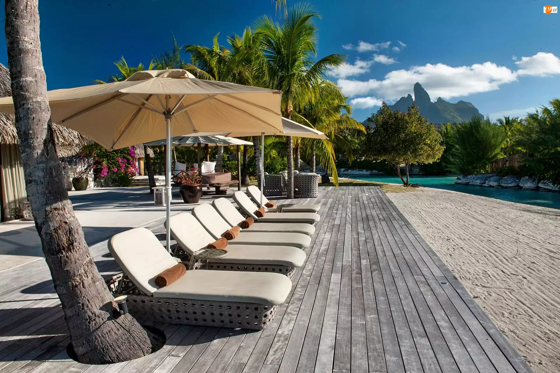 Palmy, Leżaki, Bora Bora, Polinezja Francuska, Wakacje, Góra, Parasole