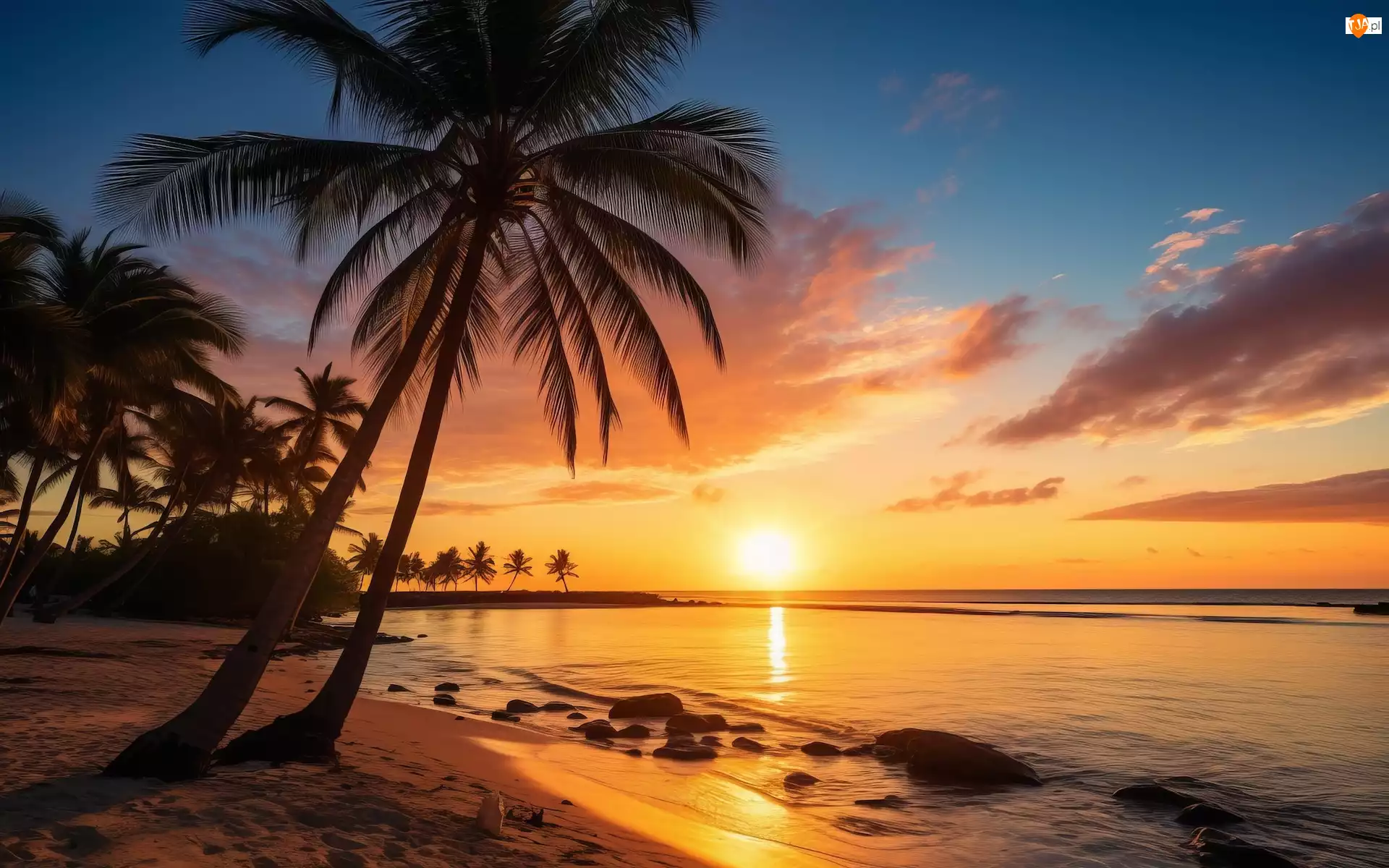 Palmy, Grafika, Wyspa, Ocean, Zachód słońca