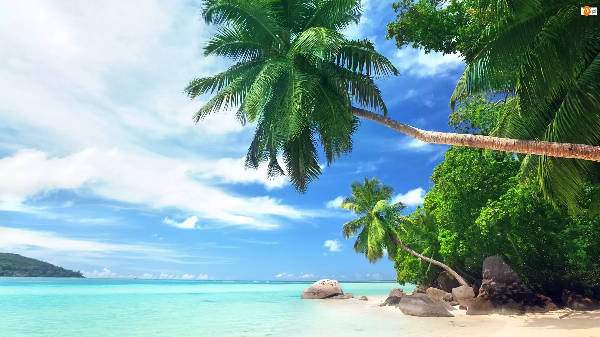 Palmy, Chmury, Pochylone, Morze, Kamienie